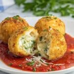 Crispy and golden Air Fryer Arancini Rice Balls, made with creamy arborio rice, melted mozzarella, parmesan cheese, and fresh herbs, coated in breadcrumbs and air fried to perfection. Served with warm marinara sauce, these Italian-inspired snacks are a delicious and healthier twist to the classic fried arancini.