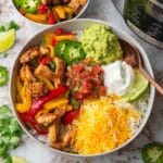 - Add toppings and serve: Finish off your fajita bowls with your favorite toppings such as shredded cheese, sour cream, salsa, cilantro, and guacamole to add extra flavor and texture. Serve immediately while hot.