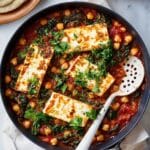 This baked feta dish combines creamy, tangy cheese with hearty kale, chickpeas, and a rich tomato sauce. It’s a comforting and flavorful meal that’s both easy to prepare and perfect for sharing with warm pita or baguette.