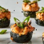 - Garnish and serve: Arrange the baked salmon sushi cups on a serving platter, drizzle with the spicy mayonnaise mixture, then sprinkle generously with black and white sesame seeds and additional sliced scallions for freshness and visual appeal. Serve immediately.