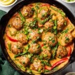 Keywords: basil ginger meatballs, red curry sauce, chicken meatballs, coconut curry, Thai meatballs, easy curry recipe
