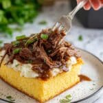 - Assemble and Serve: Place a serving of mashed potatoes on a slice of garlic toast. Spoon the shredded beef and gravy generously on top. Garnish with fresh chopped parsley if desired and serve hot.
