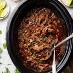 - Shred the beef: Either directly in the slow cooker or by transferring the beef to a large plate or rimmed baking sheet, use two forks to shred the meat into bite-sized pieces. Stir the shredded beef back into the braising liquid to soak up flavors. Fold in the ½ cup of fresh chopped cilantro and mix again.