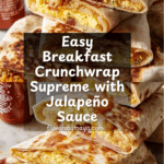 The Breakfast Crunchwrap Supreme is a delicious and satisfying morning meal that combines crispy hash browns, fluffy scrambled eggs, savory bacon, and melty cheese, all wrapped in a warm tortilla with a creamy jalapeño sauce. It’s a fun twist on classic breakfast flavors, perfect for a hearty start to your day.