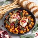 This elegant appetizer features creamy burrata cheese paired with sweet maple-roasted butternut squash, topped with a tangy pomegranate balsamic reduction, crispy sage leaves, and jewel-like pomegranate seeds. Served with assorted crackers and bread, it’s a perfect balance of savory, sweet, and tart flavors with a luscious texture contrast.