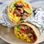 This California Burrito recipe combines marinated and skillet-cooked steak with crispy French fries, melted cheddar cheese, fresh pico de gallo, creamy guacamole, and tangy sour cream, all wrapped in warm flour tortillas. This flavorful burrito can also be lightly grilled for a golden, crispy exterior, making it a satisfying and hearty meal perfect for any time of day.