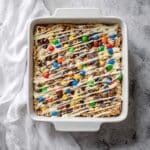 - Step 5: While the bars are still warm, sprinkle chocolate chips and M&M candies evenly over the top.