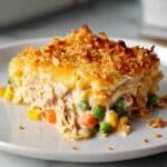 This comforting Chicken and Hashbrown Casserole combines tender cooked chicken, crispy hash browns, mixed vegetables, and creamy condensed soup, all topped with a crunchy Ritz cracker and cheddar cheese topping. Baked to golden perfection, this hearty casserole is perfect for an easy family dinner or potluck dish.
