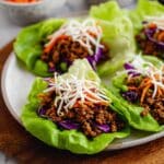 These delicious Chicken Lettuce Wraps offer a flavorful and healthy meal option featuring ground chicken sautéed with garlic, ginger, and a savory homemade teriyaki sauce. Served in crisp butterhead lettuce leaves and accompanied by fried rice noodles and red cabbage, this dish combines savory, fresh, and crunchy elements for a satisfying bite.