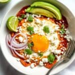 - Serve and Garnish: Plate the chilaquiles and top with fried eggs, crema, queso fresco, salsa macha, red onion, sliced avocado, fresh cilantro, and a squeeze of lime to taste. Enjoy immediately.