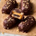 These Chocolate Covered Snickers Stuffed Dates are a delicious and healthier twist on a classic candy bar. Medjool dates are filled with creamy peanut butter and crunchy peanuts, then coated in rich dairy-free dark chocolate. This easy no-bake treat combines sweet, salty, and nutty flavors and a variety of textures for a satisfying snack or dessert that’s gluten-free and vegan-friendly.