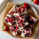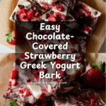This Chocolate-Covered Strawberry Greek Yogurt Bark is a delicious and refreshing frozen treat that combines creamy Greek yogurt with sweet maple syrup, fresh strawberries, and rich semi-sweet chocolate. Easy to make and perfect for a healthy snack or dessert, it delivers a delightful balance of flavors and textures with a hint of vanilla and optional flaky sea salt.