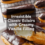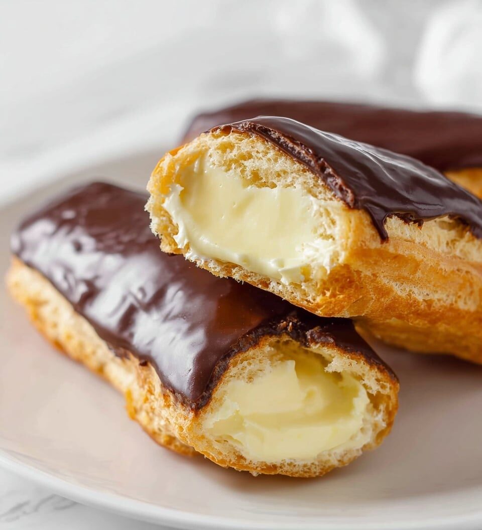 Classic French éclairs made with delicate choux pastry filled with rich vanilla pastry cream and topped with a smooth chocolate glaze. This recipe guides you through baking the perfect light and airy pastry shells, preparing a creamy custard filling, and finishing with a glossy chocolate coating for an irresistible dessert.