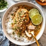 - Serve: Plate the chicken over cooked rice and garnish with chopped cilantro, green onions, chopped peanuts or cashews, and lime wedges on the side for extra zest and crunch.