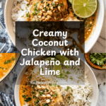 Coconut Chicken is a flavorful and creamy dish featuring thinly sliced chicken breasts simmered in a rich coconut milk sauce with spices, garlic, ginger, and a hint of heat from jalapeños. Topped with fresh cilantro, green onions, and crunchy nuts, this comforting meal pairs perfectly with rice for a satisfying and exotic dinner.