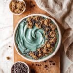- Assemble the bowl: Spoon the spirulina smoothie into a serving bowl. Top generously with portions of the homemade cookie dough. Sprinkle the top with optional chocolate covered chia seeds and crunchy cacao nibs for texture and extra flavor.