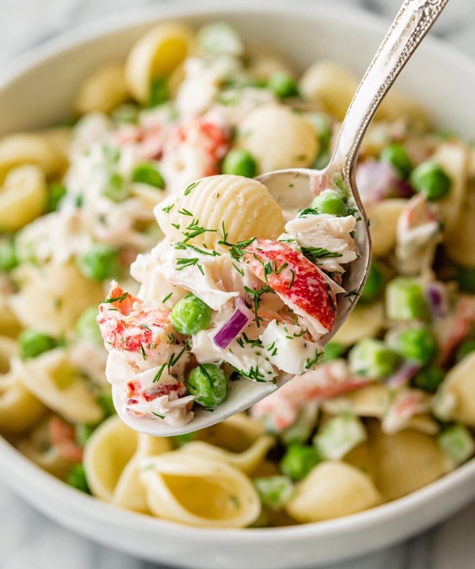 - Mix Ingredients: In a large mixing bowl, combine the cooled pasta, imitation crab meat, thawed peas, chopped red onion, celery, red bell pepper, mayonnaise, and dill. Gently stir the mixture until all ingredients are evenly coated with the dressing.