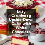 This delicious Cranberry Upside-Down Cake combines the tartness of fresh cranberries with the sweetness of a white cake base and white chocolate accents. The cranberries are baked at the bottom of the pan to create a vibrant fruit layer that becomes the top once the cake is inverted after baking. Garnished with white chocolate curls, sugared cranberries, and optional whipped cream, this dessert is perfect for holiday celebrations or any occasion that calls for a festive and flavorful treat.