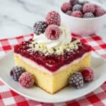 - Garnish: Decorate the top of the cake with white chocolate curls made from the white chocolate bar, sugared cranberries, and optional whipped cream.
