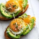 Crispy Egg Yolks on avocado toast featuring perfectly fried, golden egg yolks coated with seasoned panko, served on toasted ciabatta with fresh avocado, garlic, and a flavorful topping of lemon zest, flaky sea salt, black pepper, chives, and Parmigiano Reggiano. A delightful texture contrast with creamy avocado and crispy egg yolks make this an elegant and simple brunch or snack.
