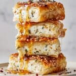 These Crispy Feta Pockets feature a creamy block of feta cheese wrapped in delicate phyllo dough seasoned with fresh thyme and lemon zest, pan-seared until golden and then baked to a warm, melty perfection. Finished with a drizzle of honey, toasted sesame seeds, and a pinch of crushed red pepper flakes, they make a delightful appetizer or snack served alongside toasted pita or pita chips.