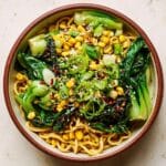 - Cook Noodles and Vegetables: Bring a large pot of salted water to a boil. Add the ramen noodles and cook according to package directions until al dente. About 1½ minutes before the noodles finish cooking, add the sliced white bok choy pieces and corn kernels to the boiling water. Just before everything is ready, add the green bok choy leaves and blanch for about 20 seconds until wilted.