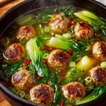 This Ginger Chicken Meatball Soup is a comforting and flavorful dish featuring tender ground chicken meatballs infused with fresh ginger and garlic, simmered in a savory chicken broth with fresh baby bok choy. Topped with crispy wonton strips and fresh green onions, this soup offers a perfect balance of warmth, texture, and taste.