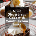 This Gingerbread Cake is a cozy and warmly spiced treat, perfect for chilly days or holiday gatherings. Moist and tender, it pairs beautifully with fresh bananas, whipped cream, and a rich vanilla cream sauce.
