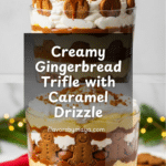 This Gingerbread Trifle is a festive and decadent layered dessert combining the warm spices of gingerbread with creamy vanilla pudding, fluffy whipped cream, and rich caramel sauce. Perfect for holiday gatherings, this no-bake treat features layers of crushed gingerbread cookies, spiced pudding, caramel drizzle, and whipped topping, all beautifully assembled in a trifle dish and chilled to set.