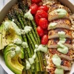 Keywords: Goddess Bowls, roasted asparagus, chicken bowls, healthy bowl recipe, yogurt herb dressing, brown rice bowl
