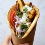 Store any leftover chicken, fries, and tzatziki separately in airtight containers in the refrigerator for up to 2 days. Reheat the chicken and fries in an oven or air fryer to maintain crispiness. Avoid reheating assembled gyros to prevent sogginess.