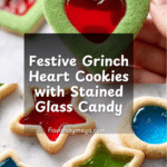 These festive Grinch Heart Cookies feature a tender green almond-flavored dough with a charming stained glass center made from melted cherry Jolly Rancher candies. Perfect for holiday celebrations, these cookies combine a buttery, soft texture with a beautiful translucent candy heart, creating a whimsical and delicious treat inspired by the Grinch.