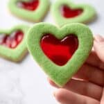 These festive Grinch Heart Cookies feature a tender green almond-flavored dough with a charming stained glass center made from melted cherry Jolly Rancher candies. Perfect for holiday celebrations, these cookies combine a buttery, soft texture with a beautiful translucent candy heart, creating a whimsical and delicious treat inspired by the Grinch.