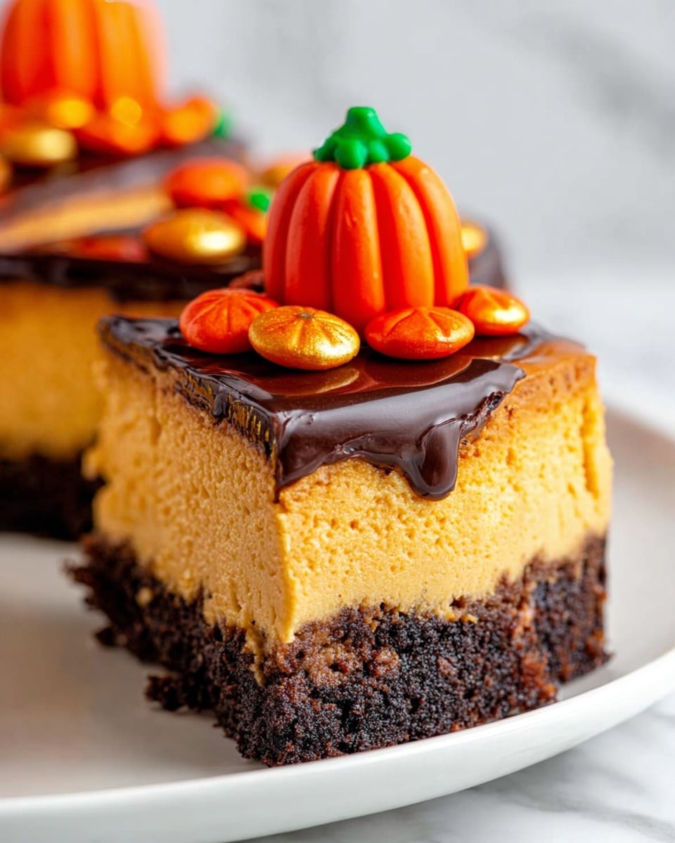 This Halloween Pumpkin Cheesecake is a festive and rich dessert perfect for fall celebrations. It features a chocolatey graham cracker crust and a creamy pumpkin-spiced cheesecake filling, baked in a water bath for a smooth, crack-free texture. Finished with a silky chocolate ganache drizzle and seasonal candy garnishes, this cheesecake offers a perfect balance of chocolate and pumpkin flavors with a delightful autumnal twist.
