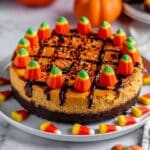 - Decorate: Drizzle the ganache over the cheesecake top as desired. Sprinkle with the candy corn, pumpkin sprinkles, and orange and black sanding sugar. Slice and serve to enjoy the perfect Halloween-themed dessert.