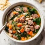 Keywords: ham and bean soup, hearty soup, Great Northern beans, ham hock, spinach soup, easy soup recipe, comfort food, stovetop soup