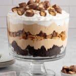 Keywords: brownie trifle, peanut butter pudding dessert, layered dessert, party desserts, easy no bake dessert, Reese’s peanut butter cups dessert