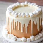 A rich and decadent Hot Chocolate Cake featuring layers of moist cocoa-infused cake, a luscious hot chocolate frosting, and a creamy marshmallow filling. Topped with a smooth white chocolate ganache and a ring of vanilla buttercream adorned with mini marshmallows and marshmallow bits, this cake is a perfect treat for chocolate lovers seeking a cozy dessert experience.