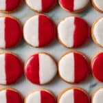 - Step 10: Spoon red icing onto one half of each cookie, aiming for a clean line down the center. Allow to dry, then spoon white icing on the other half. Let the cookies sit until the icing is fully set.