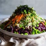 - Serve: Give the slaw another gentle toss to redistribute the dressing. Transfer the salad to a serving platter or bowl. Arrange the remaining seaweed salad in clumps on top along with the rest of the edamame. Drizzle the reserved dressing over the top for extra flavor. Serve immediately and enjoy the fresh, tangy crunch.