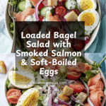 Loaded Bagel Salad is a vibrant, fresh salad combining peppery arugula, smoked sockeye salmon, soft boiled eggs, and crunchy toasted everything bagel pieces. Tossed with a creamy, tangy dressing made of cream cheese, Dijon mustard, and lemon, this salad offers a flavorful twist on traditional bagels with lox, perfect for a light yet satisfying meal.