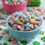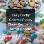 Keywords: Lucky Charms Puppy Chow, Puppy Chow Recipe, Chocolate Peanut Butter Snack, Chex Cereal Snack, Powdered Sugar Treat, Kid-Friendly Snack