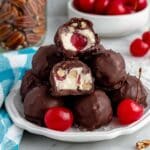 Martha Washington Candy is a delightful no-bake treat featuring a rich and chewy coconut and cherry center coated in smooth chocolate. This nostalgic candy combines shredded coconut, maraschino cherries, chopped pecans, and sweetened condensed milk, rolled into bite-sized balls and dipped in melted chocolate for a perfect sweet indulgence perfect for holidays and special occasions.