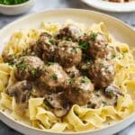 A comforting and hearty Meatball Stroganoff recipe featuring tender homemade beef meatballs simmered in a creamy mushroom and French onion soup sauce. Perfect for a family dinner, this dish combines classic stroganoff flavors with easy-to-make meatballs served over egg noodles.
