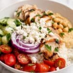 - Assemble the Bowls: Divide the cooked rice evenly into four bowls. Top each bowl with slices of cooked chicken, chickpeas, chopped cucumber, quartered grape tomatoes, and sliced red onion. Add dollops of hummus and tzatziki on the side and sprinkle with crumbled feta cheese. Optionally, drizzle a little extra Greek dressing over the top for added flavor.