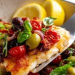 PrintMediterranean-Style Barramundi with Cherry Tomatoes, Olives, and Basil Recipe