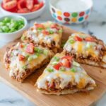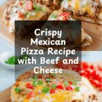 Keywords: Mexican pizza, ground beef recipe, enchilada sauce, refried beans pizza, easy Mexican food, tortilla pizza