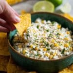 Keywords: Mexican Street Corn Dip, elote dip, grilled corn dip, party appetizer, cotija cheese dip, Mexican appetizer, tortilla chip dip