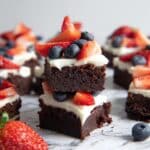 - Assemble and Serve: Once completely cooled, cut the brownies into 16 small squares. Top each piece with a dollop of the vanilla bean Greek yogurt and garnish with sliced strawberries and blueberries. Serve immediately and enjoy.