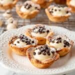 - Fill Pastry Cups: Just before serving, remove the filling from the refrigerator. Snip off one corner of the bag and pipe about 1 tablespoon of filling into each cooled pastry cup. Top each with miniature chocolate chips or finely chopped pistachios, then dust with additional powdered sugar for a beautiful finish.
